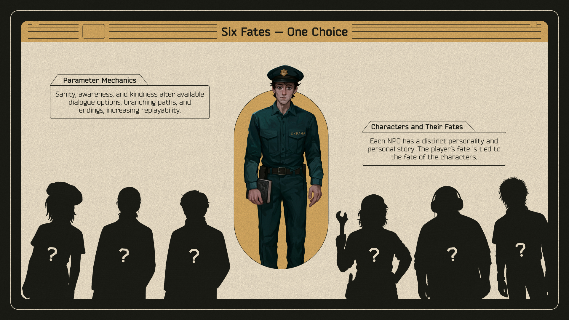 You are Sergey Ovcharov, a guard who - together with a handful of survivors - becomes trapped in a labyrinth with no windows, no exits… only walls that breathe and statues that shouldn’t exist.